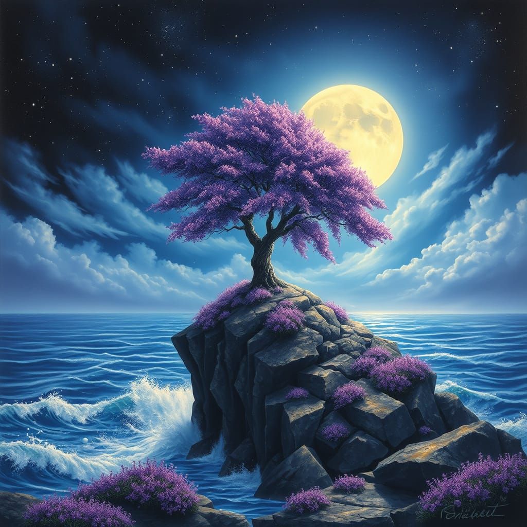 A serene nighttime landscape. A large, luminous moon illuminates the dark sky, casting a gentle glow on the clouds. Below, a vibrant tree with purple leaves stands atop a rocky outcrop, overlooking a calm sea. There are mounds of purple flowers around the outcrop.The waves gently crash against the rocks, ...