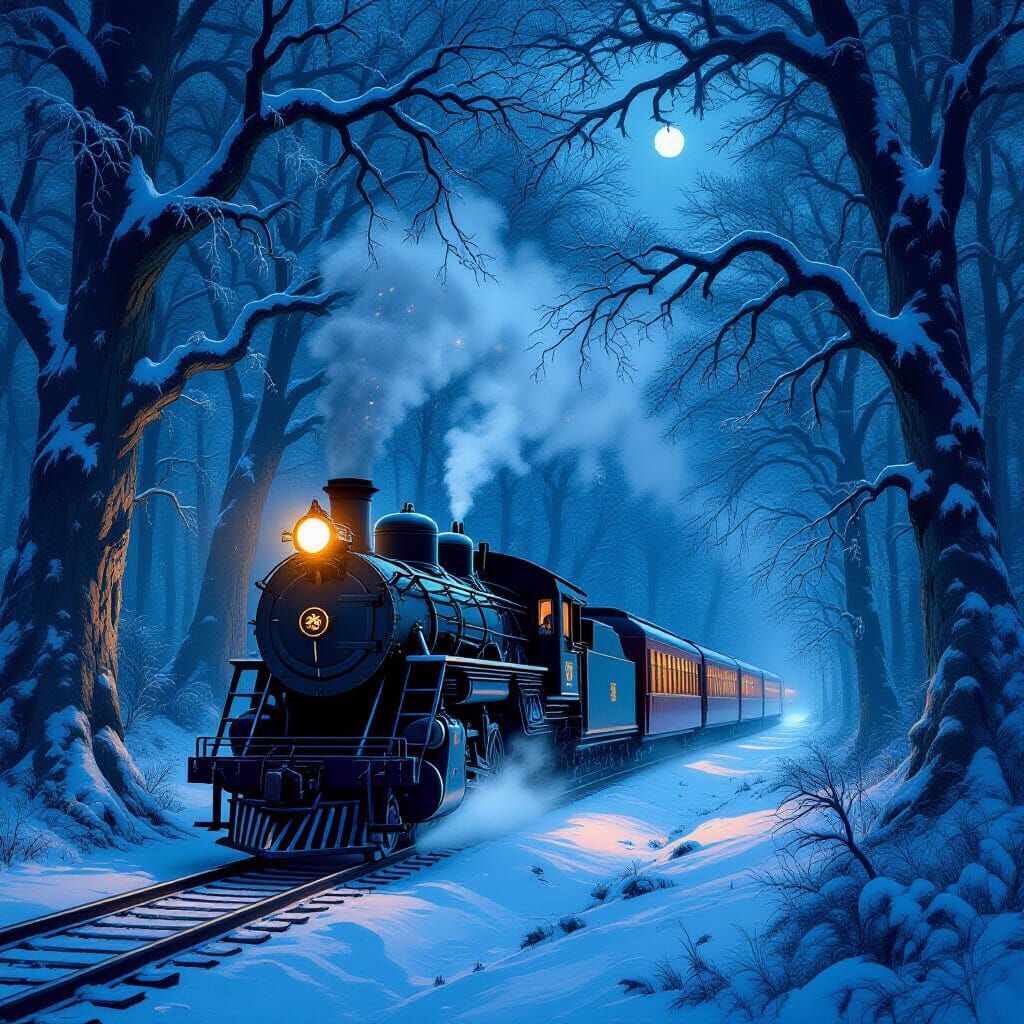 A solitary vintage steam train travels through a snowy, enchanted forest with luminous trees. Warm light from the train contrasts with the cool night glow, in a dark fantasy illustration style.