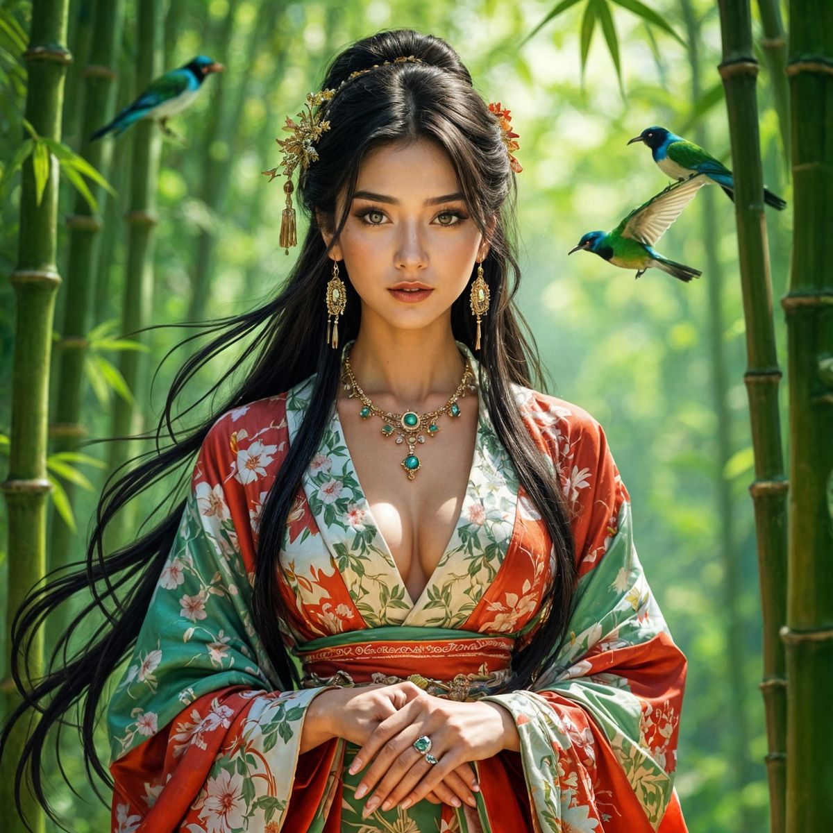 A hyperrealistic portrait of a striking Chinese woman in silk robes, standing in a lush bamboo forest. The artwork blends luxurious Art Deco curves with futuristic digital art and ornate details.