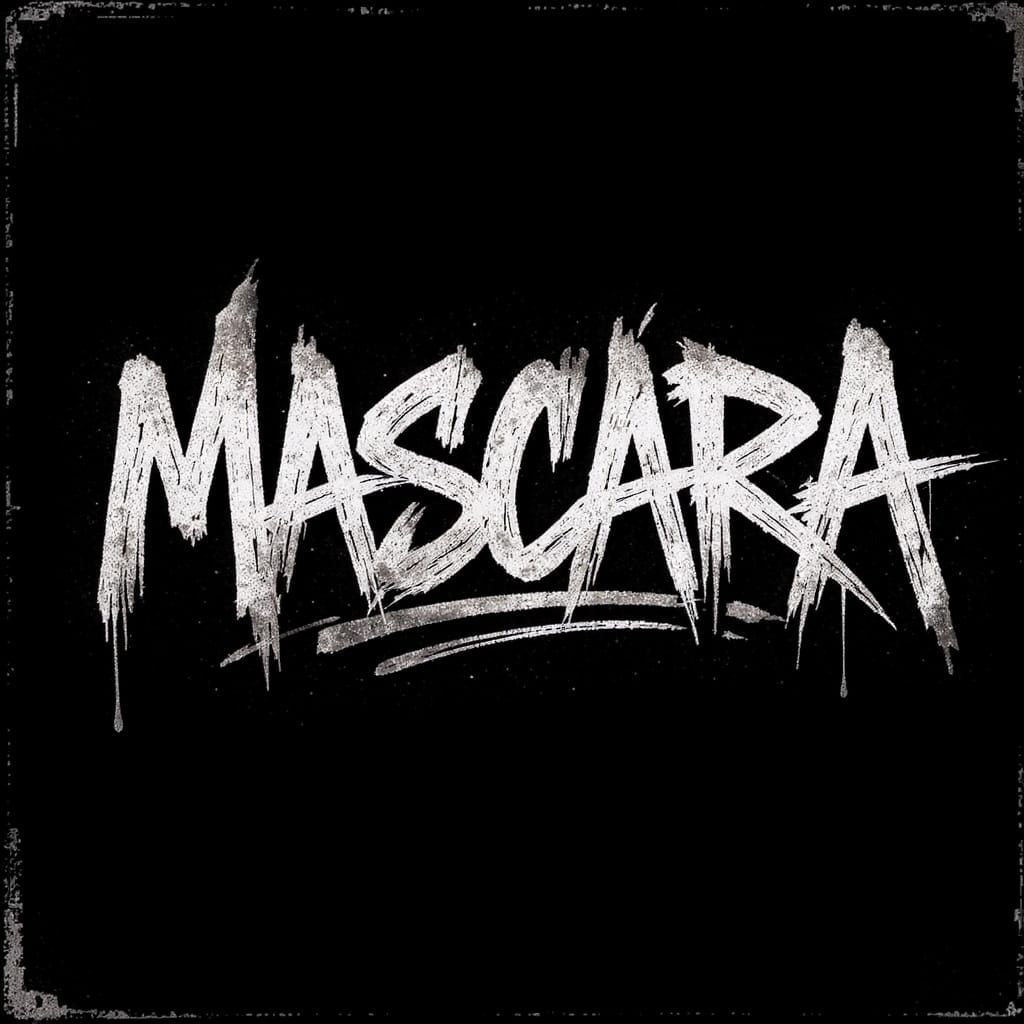 A striking picture of the word "MASCARA" rendered in a graffiti style. The typography is bold and white against a black backdrop, with distressed edges creating a dark, edgy aesthetic.