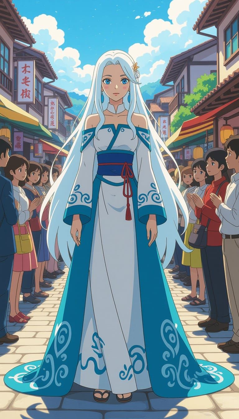 This image shows a striking princess from Planet Ikatro with long white hair and blue eyes, standing in a lively street square. Rendered in a vibrant, detailed anime concept art style with natural lighting.