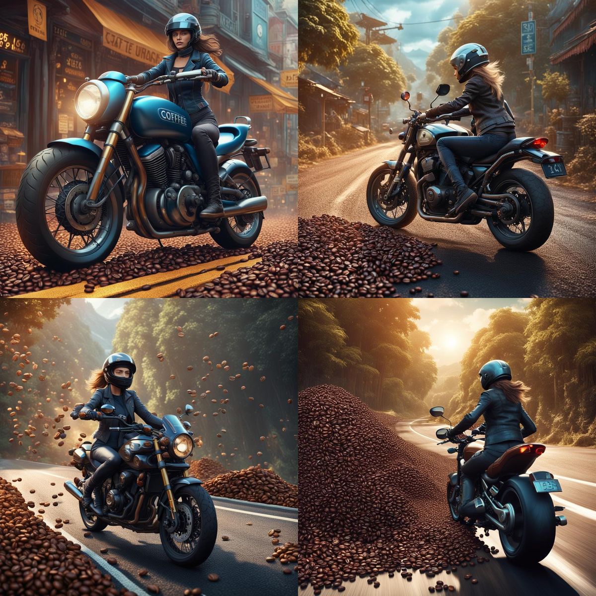 This image shows a young woman riding a motorcycle on a road strangely covered with coffee beans. The scene is rendered as a detailed matte painting with complementary colors.