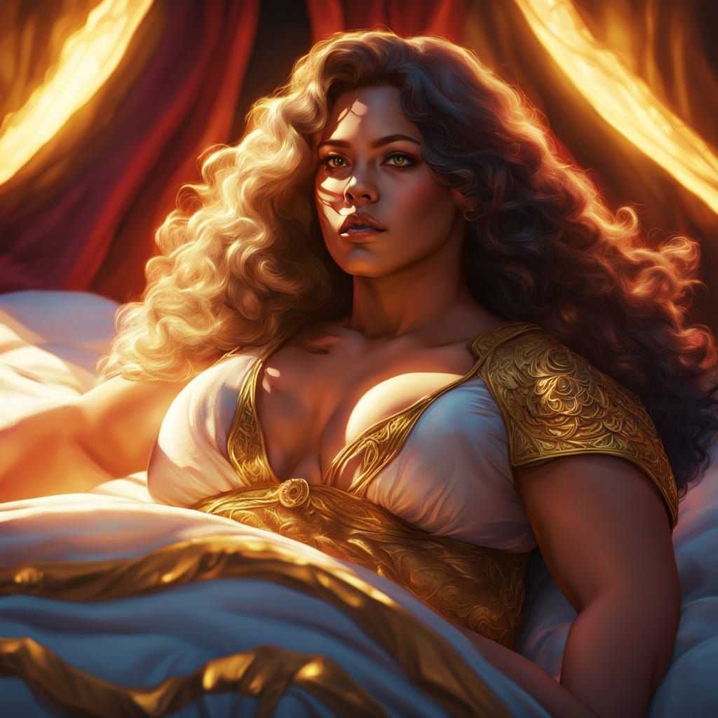 This image showcases a big woman in a fantasy illustration style, set against a cinematic composition with golden lighting and deep shadows. The vibrant triadic colors bring her soft, detailed skin to life, creating a visually stunning scene.