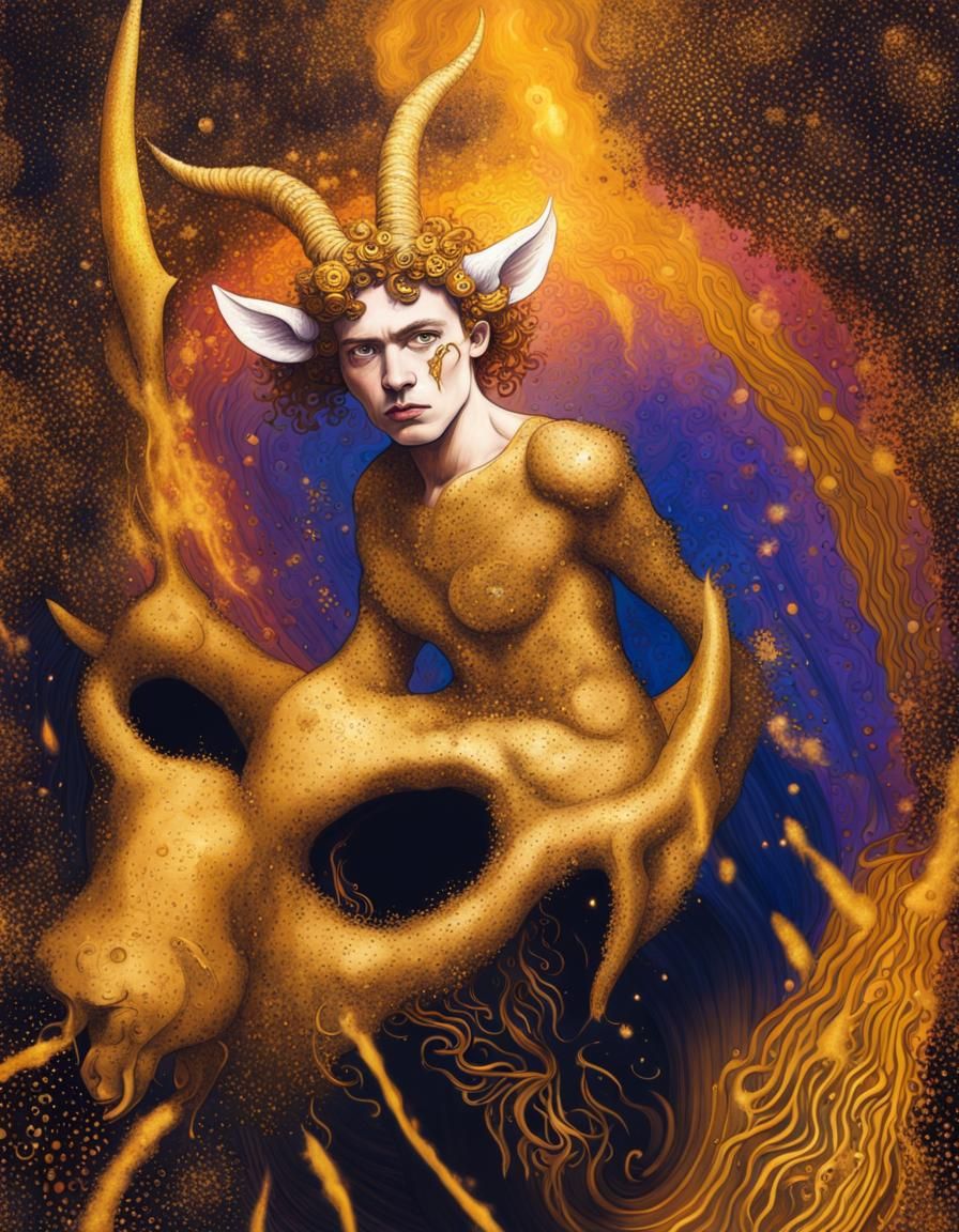 A striking image of a horned figure with intense eyes, illuminated by sparks. The portrait features intricate details, golden accents, and symbolic patterns, rendered in a splash art style.