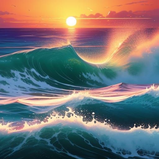 This image shows a ship sailing on the ocean during a sunset, depicted in a vibrant, cel-shaded anime style. The artwork features crashing waves, seagulls, and warm, cinematic lighting.