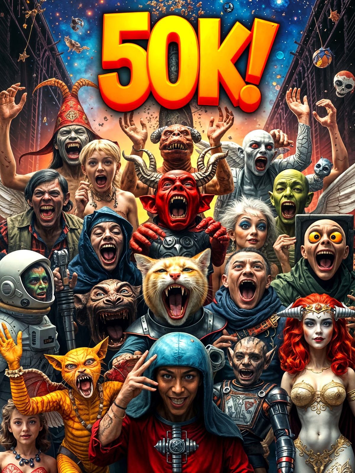 This image shows a vibrant and diverse group of characters celebrating a milestone. The eclectic mix of figures includes fantasy, sci-fi, and mythological beings in a digital art style.
