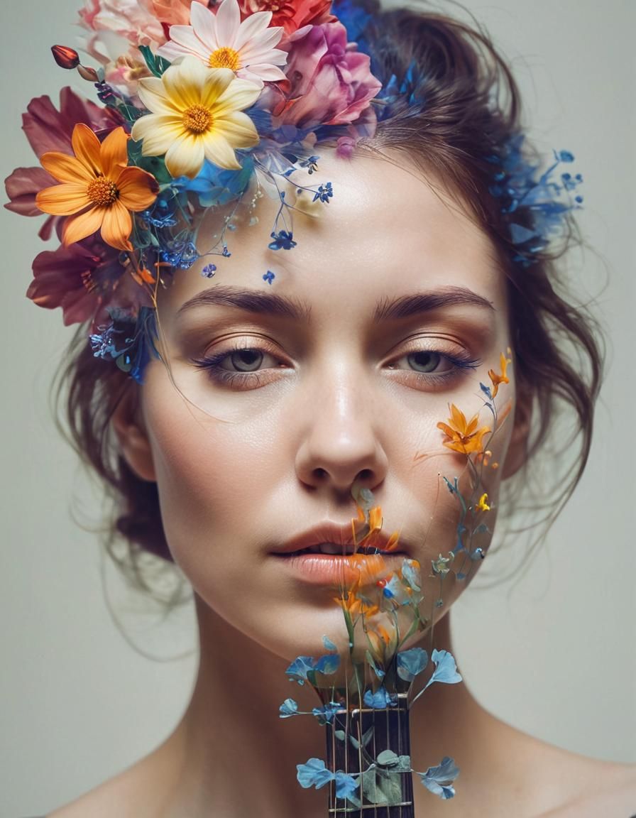 This image shows a vibrant double exposure artwork of a woman's face seamlessly blended with flowers. The colorful art style features intricate details creating a surreal merging of elements.