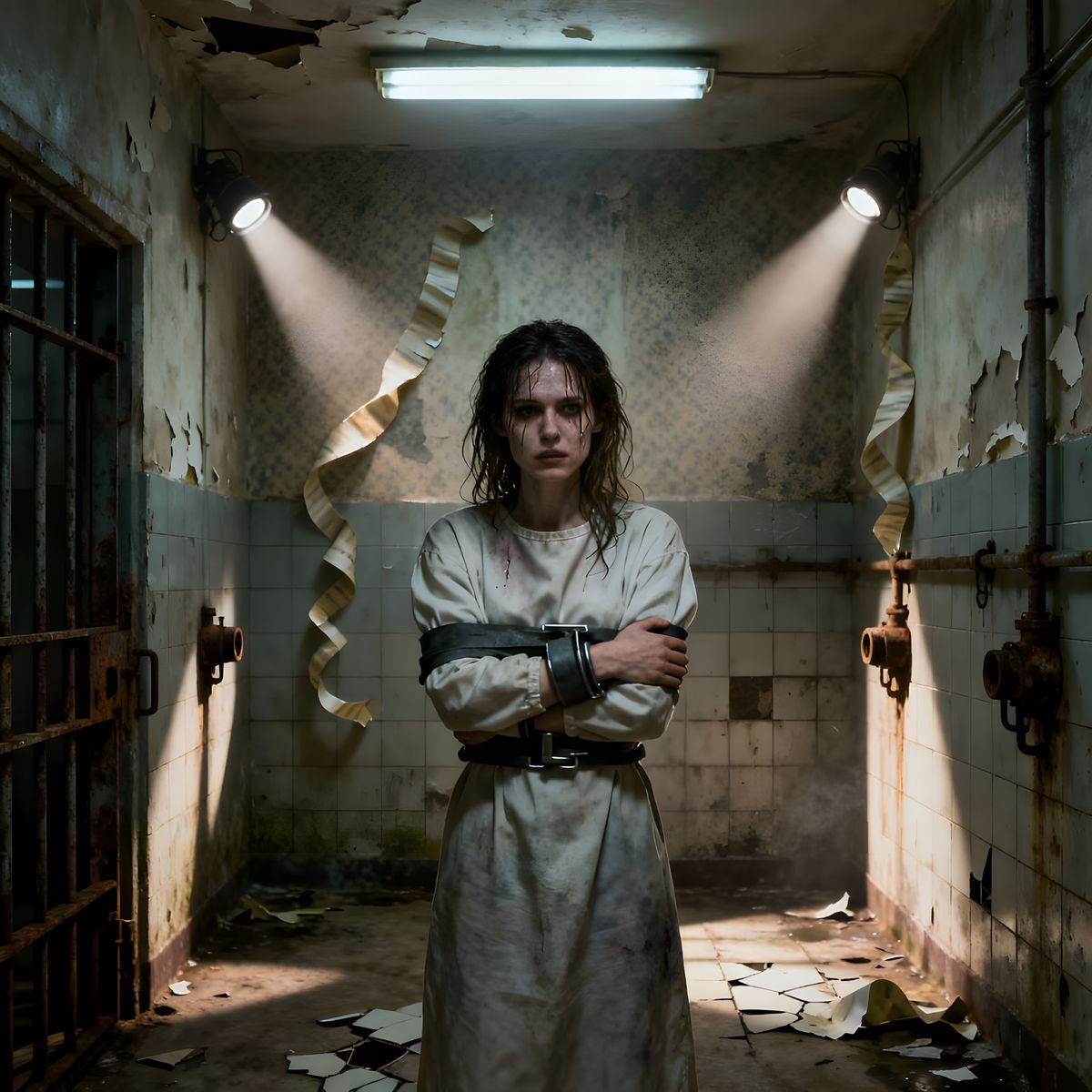 This highly realistic image depicts a woman with messy hair, restrained in a white jacket within a dirty, dimly lit asylum. The scene evokes a sense of unease with off-kilter wallpaper and directional lighting.