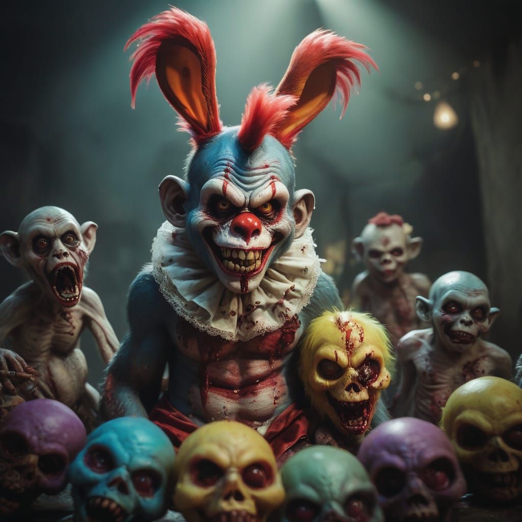 A haunting image of a grinning, maniacal creature, a zombie monkey monster clown bunny surrounded by bloody monkey skulls and adorable, yet terrifying, little zombie monkey monster clown babies, shot in a cinematic film still aesthetic with film grain and vibrant color grading.