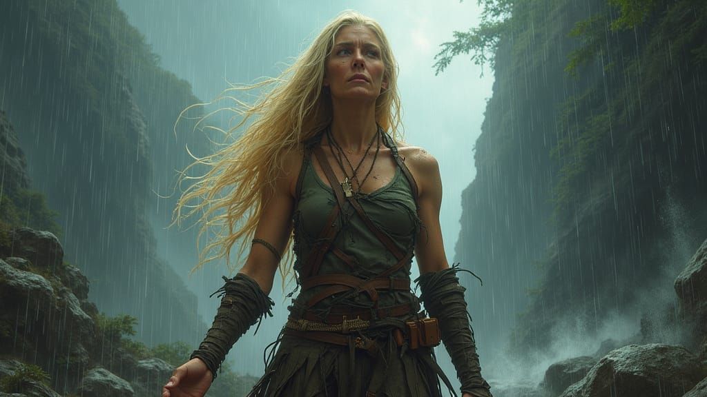 A woman stands resolutely amidst a raging storm, her unwavering spirit radiating resilience. The turbulent landscape, with rough-hewn trees and jagged rocks, is illuminated by flashes of lightning, while her tattered clothing clings to her figure, showcasing intricate digital painting details and vibrant...