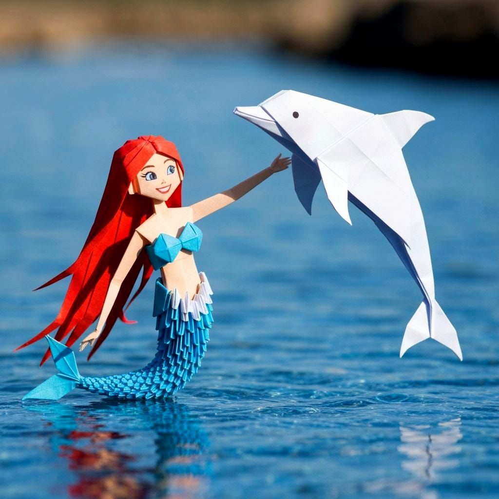 This image shows a whimsical paper origami mermaid interacting playfully with an origami dolphin. The artwork captures a sense of delicate craftsmanship.