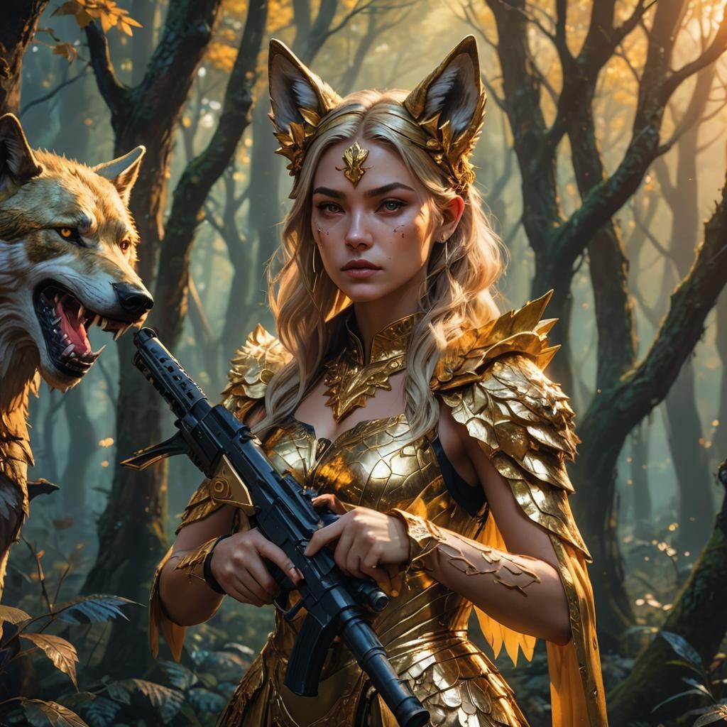 This image shows a girl with wolf ears in a mystical forest, holding a gun and wearing a gold dress. The fantasy art features vibrant triadic colors and luminescent scenery in a soft focus.