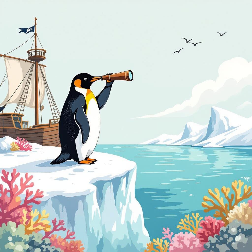 This image shows a penguin privateer on an iceberg ship, using a telescope to survey a coral reef. The scene is rendered in watercolor with soft brushstrokes and pastel hues.