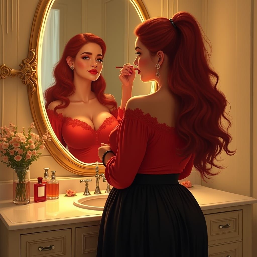 This image shows a curvy woman with long red hair applying lipstick in a golden bathroom. The digital painting features elegant lines and vibrant colors in an art nouveau style.