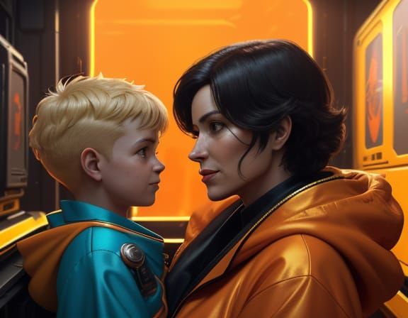 This AI-generated image shows a mother and son in a vintage sci-fi park, bathed in warm golden hour light. The art style features vibrant colors, impasto texture, and emotive brushstrokes.