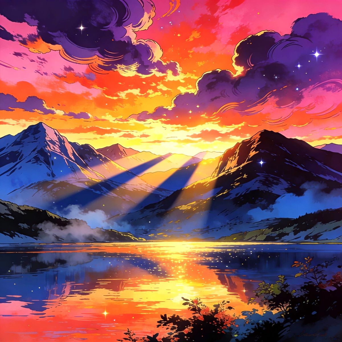 This image showcases a breathtaking sunset landscape with intricate details and deep vivid colors. It blends anime aesthetics with the dramatic lighting and rich tones reminiscent of oil paintings.