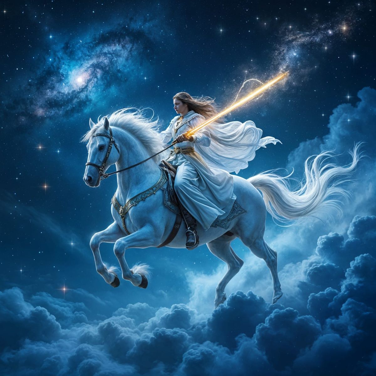 This image shows a rider on a spectral horse galloping across a starry night sky. The rider holds a glowing saber, scattering stars. Below, the world sleeps in soft moonlight, rendered in shimmering blue tones.