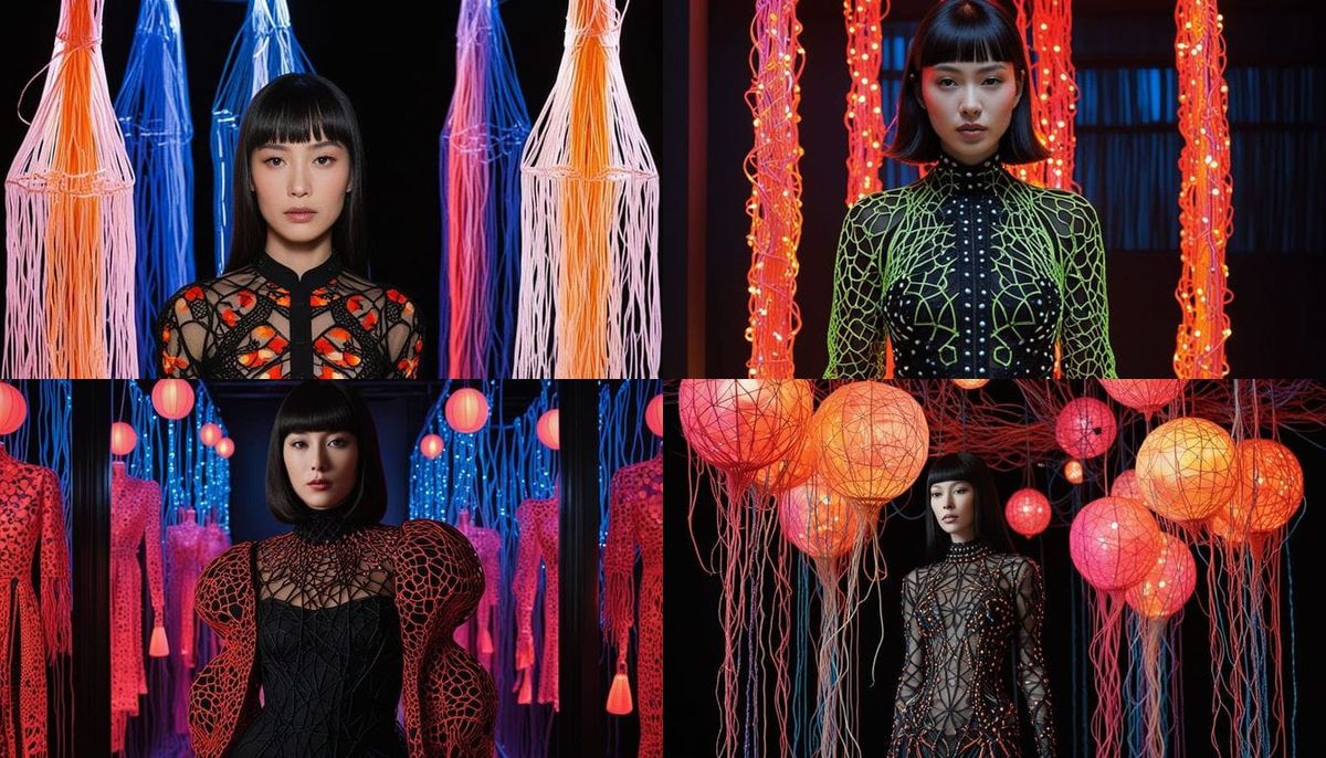 (Electric Neons:1.5) Sheer Shibori: A (Macramé:1.5) Portrait of Thierry Mugler Yayoi Kusama’s (Dreamscape:1.5)