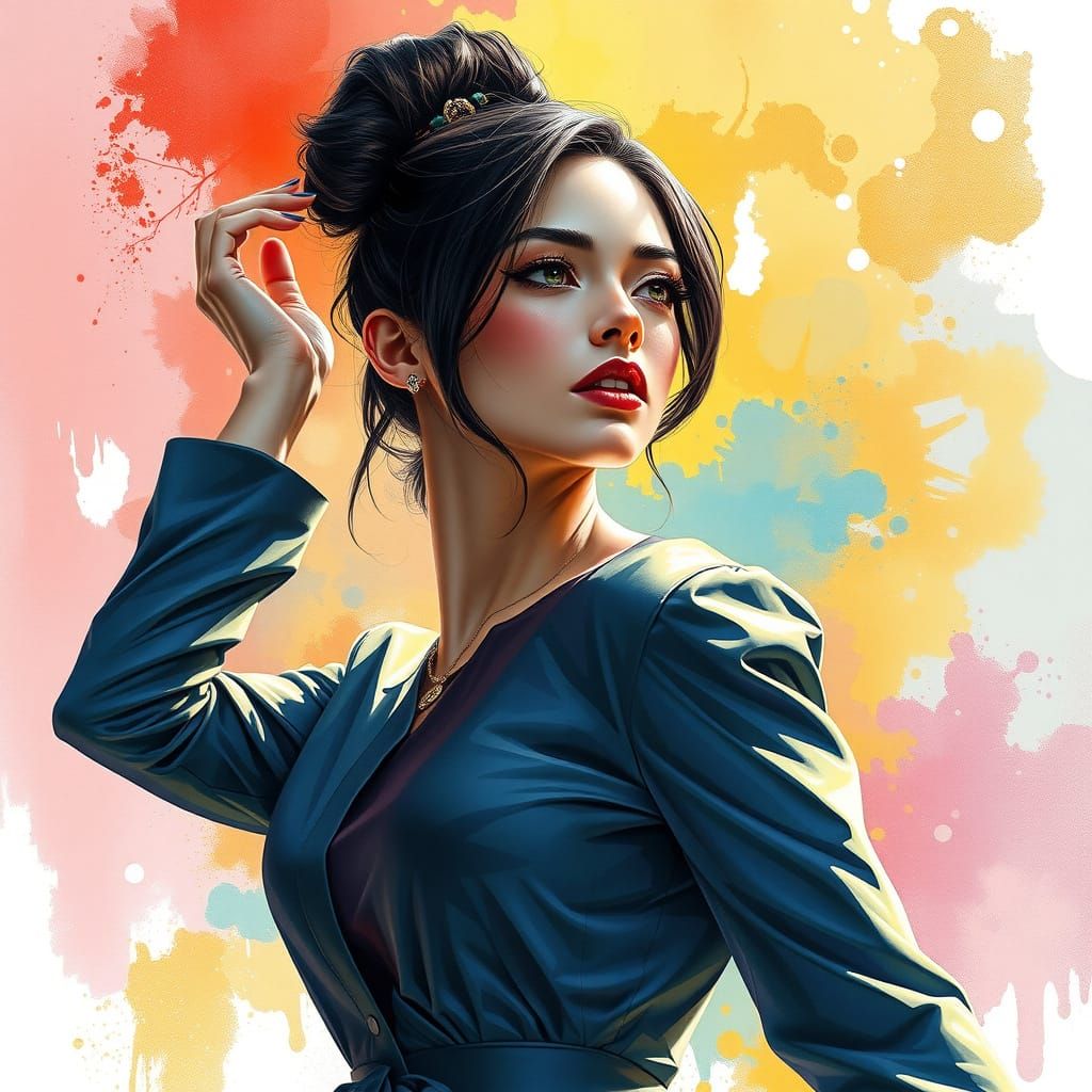 A hyperrealistic image of a woman in an elegant outfit striking a dynamic pose. The portrait features watercolor textures and digital illustration elements, emphasizing intricate details and a soft, side light.
