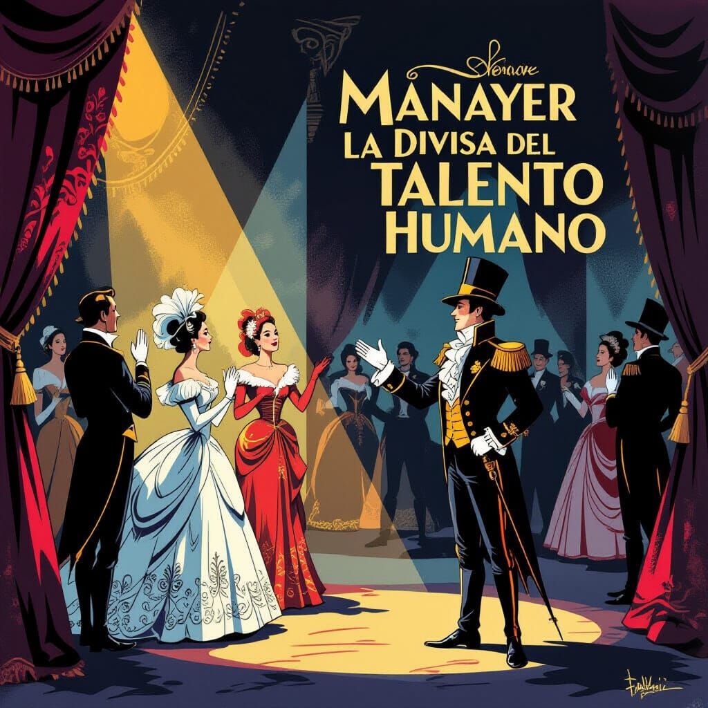 This highly detailed illustration captures a grand, theatrical farewell with stylized figures in ornate attire. It features a rich color palette and dramatic lighting, evoking spectacle and melancholy.