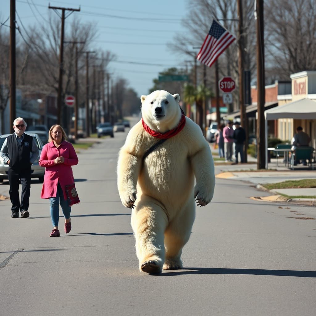 This image shows a polar bear dressed in human clothing walking down a street. Several people are glancing in the bear's direction, but otherwise, he is being ignored.