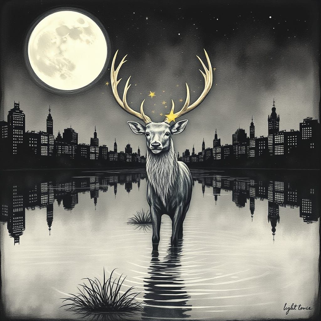 A striking picture of a stag with star-adorned antlers standing in a moonlit lake. Reflected in the water, the black and white cityscape creates a mystical atmosphere in a surreal style.