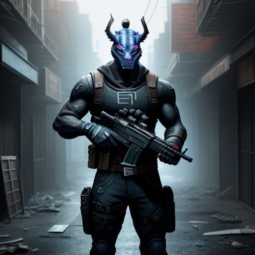 This image is a hyper-realistic depiction of a Fortnite character in a dark, abandoned city alleyway, surrounded by guns and bathed in vibrant neon colors and high contrast lighting.