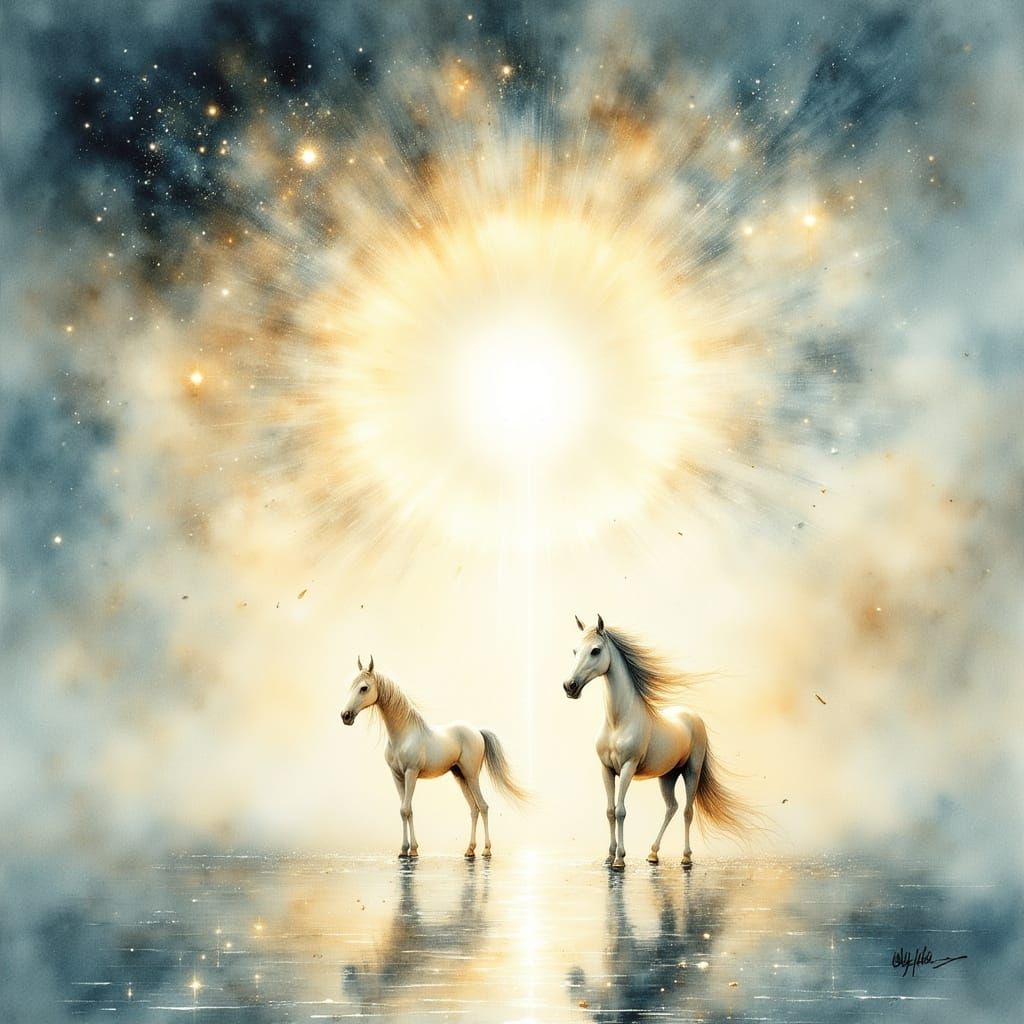 This ethereal illustration depicts the soul of a child and a horse being pulled apart by a radiant light, rendered in a delicate Japanese watercolor style with soft washes and flowing strokes.