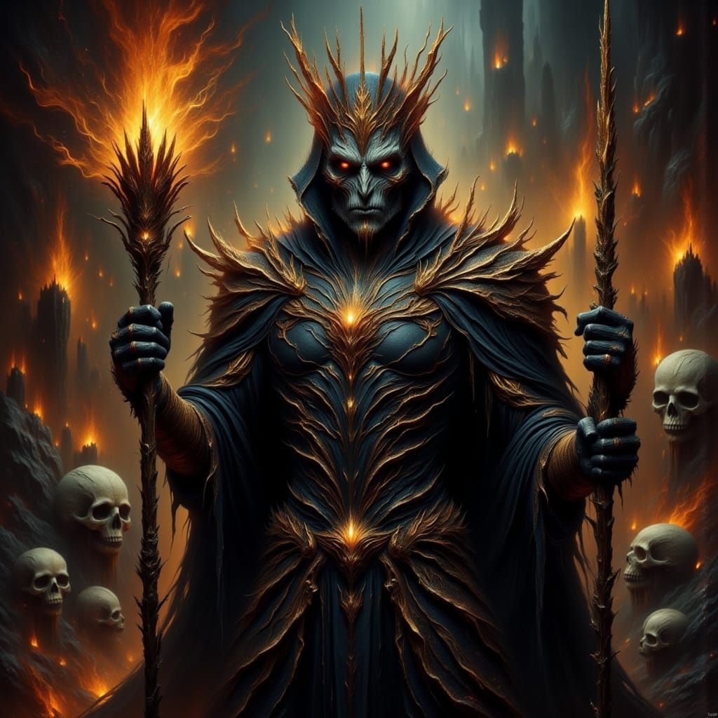 This image depicts a terrifying emperor in a black uniform adorned with gold seams and a crown. The gloomy atmosphere is enhanced by a scorched background with skulls, and the emperor carries a torch.