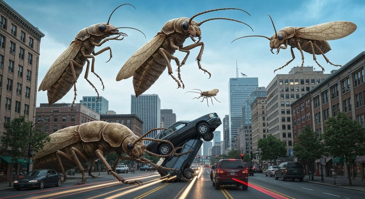 This image shows prehistoric arthropods overwhelming a modern city. Giant insects and arachnids the size of vehicles and buildings dominate the urban landscape, creating a surreal and slightly eerie long exposure effect.