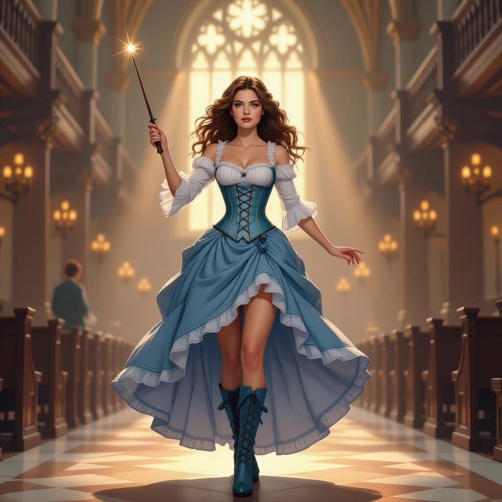 A vibrant image of a woman in Victorian-inspired clothing holding a wand in a grand hall. The artwork features whimsical lines and dramatic lighting.