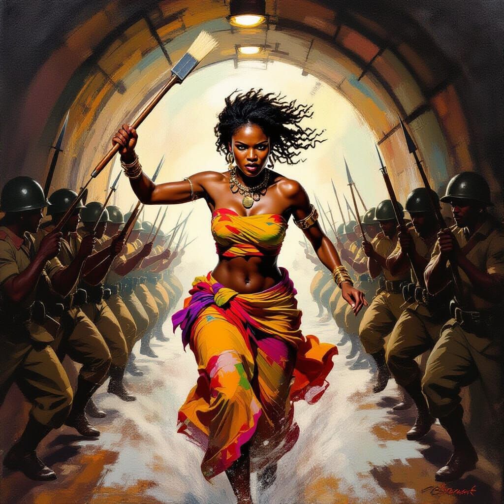 A vibrant image of a young African queen fleeing through a tunnel, surrounded by soldiers. The artwork features expressive brushstrokes and dramatic lighting, in the style of contemporary figurative painting.