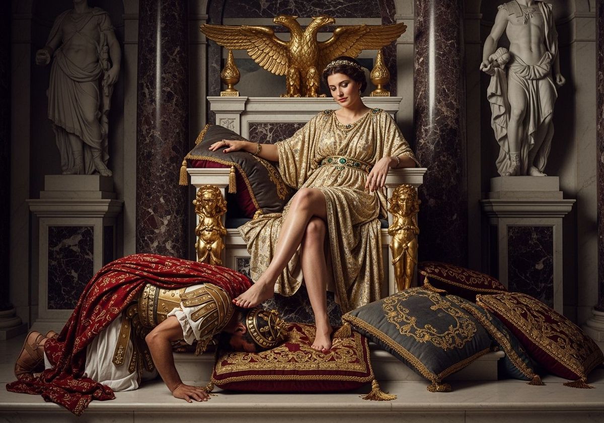 This image shows Empress Messalina on a throne, with a defeated king bowing at her feet. The artwork evokes the style of classical baroque masters through natural lighting and sharp focus.