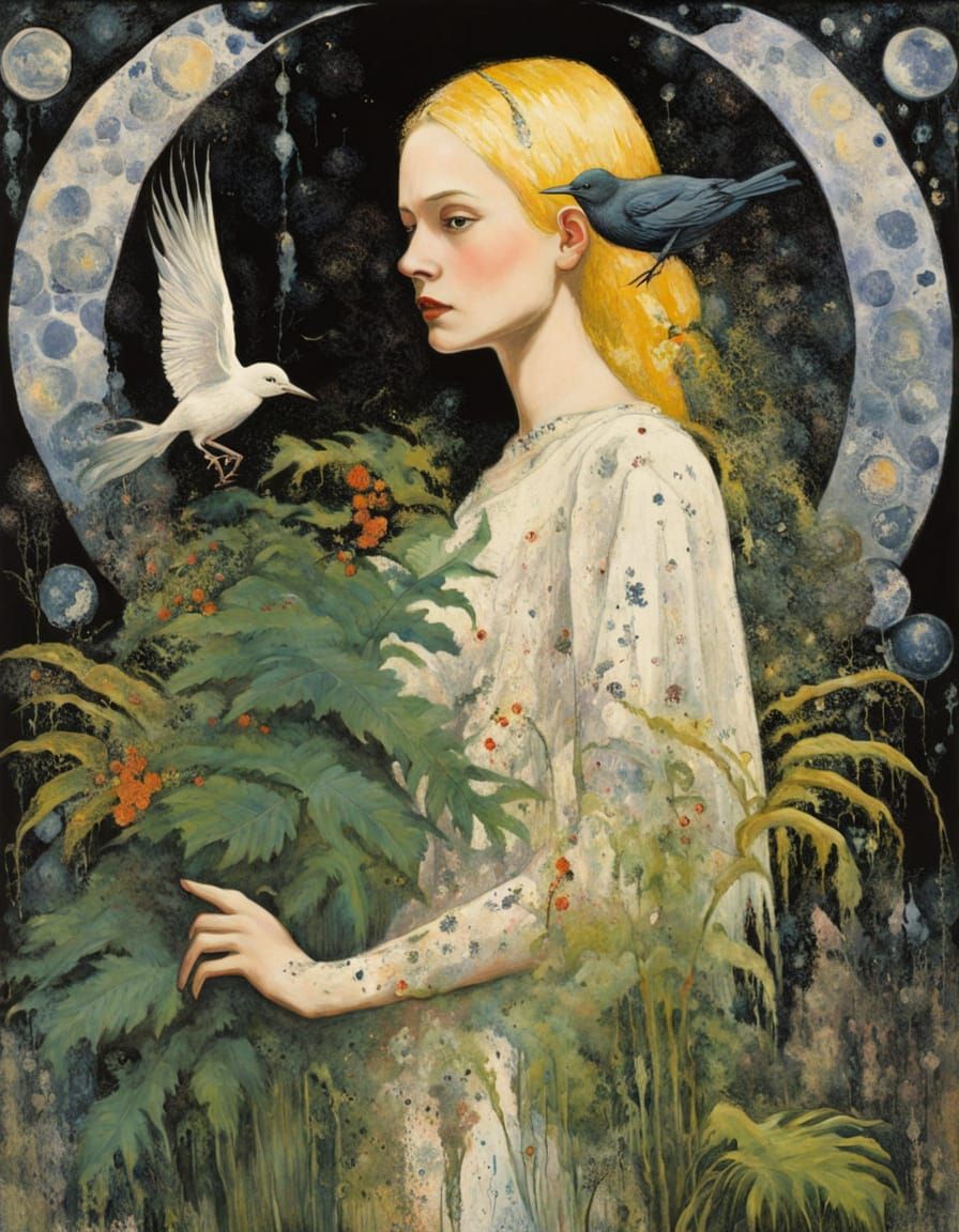 This image shows a young maiden surrounded by lush greenery, vibrant flowers, and a bird, rendered in a dynamic expressionist style with bold brushstrokes and vivid colors.