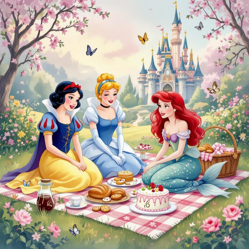 This image shows a magical picnic scene with four princesses enjoying treats on a checkered blanket. Butterflies flutter around them in a fairytale garden with a Disney-style castle, rendered as a light watercolor illustration.