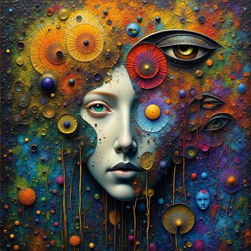This image depicts a serene face emerging from water, surrounded by swirling patterns and diverse emotional expressions. It features iridescent mosaic and luminous colors, in a detailed digital art style.