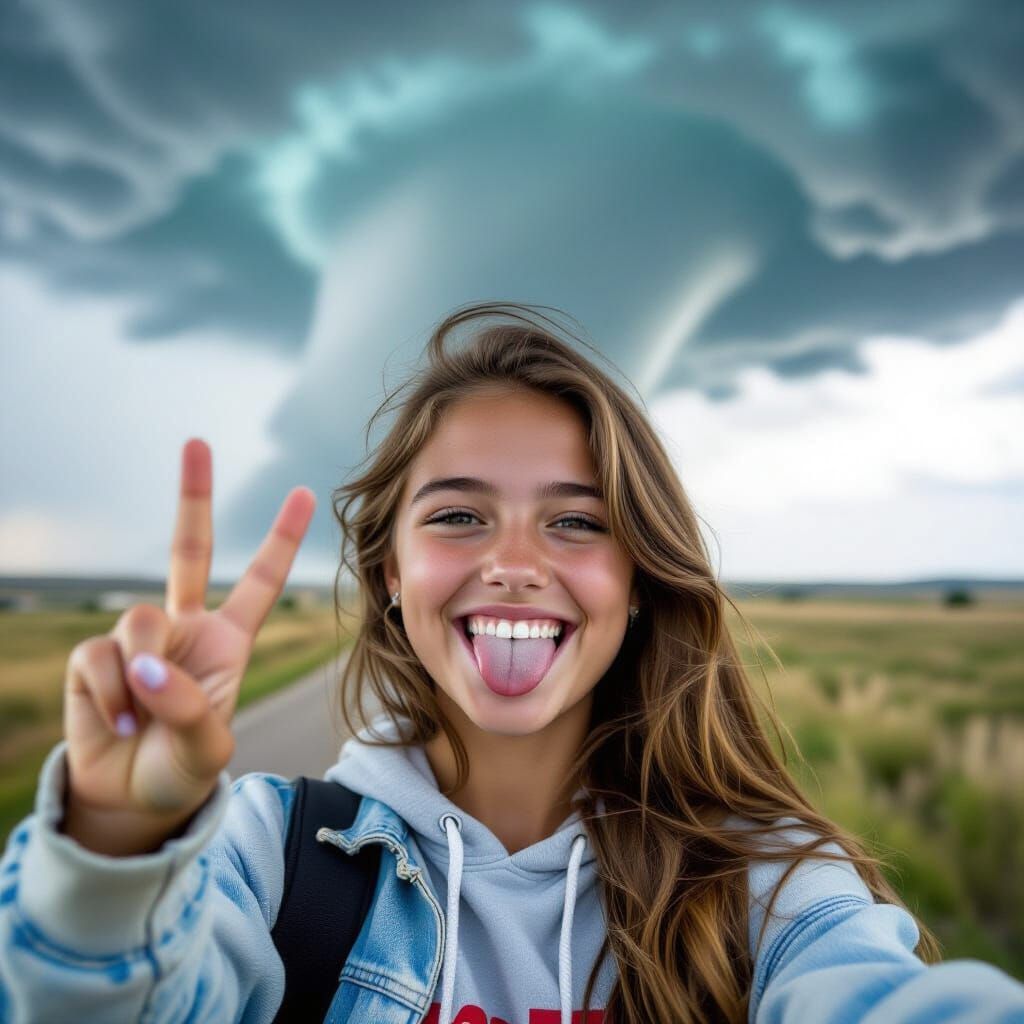 This image shows a smiling teenage girl taking a selfie with a tornado in the background. The photojournalistic style captures the dramatic sky and the girl's cheerful expression.