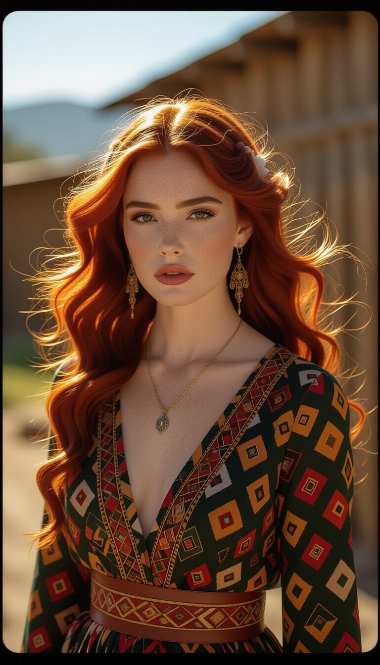 This image shows a mesmerizing woman with auburn hair formed into geometric shapes. The artwork, reminiscent of Chicano art and Romanticism, captures a cinematic feel with film grain and dramatic lighting.