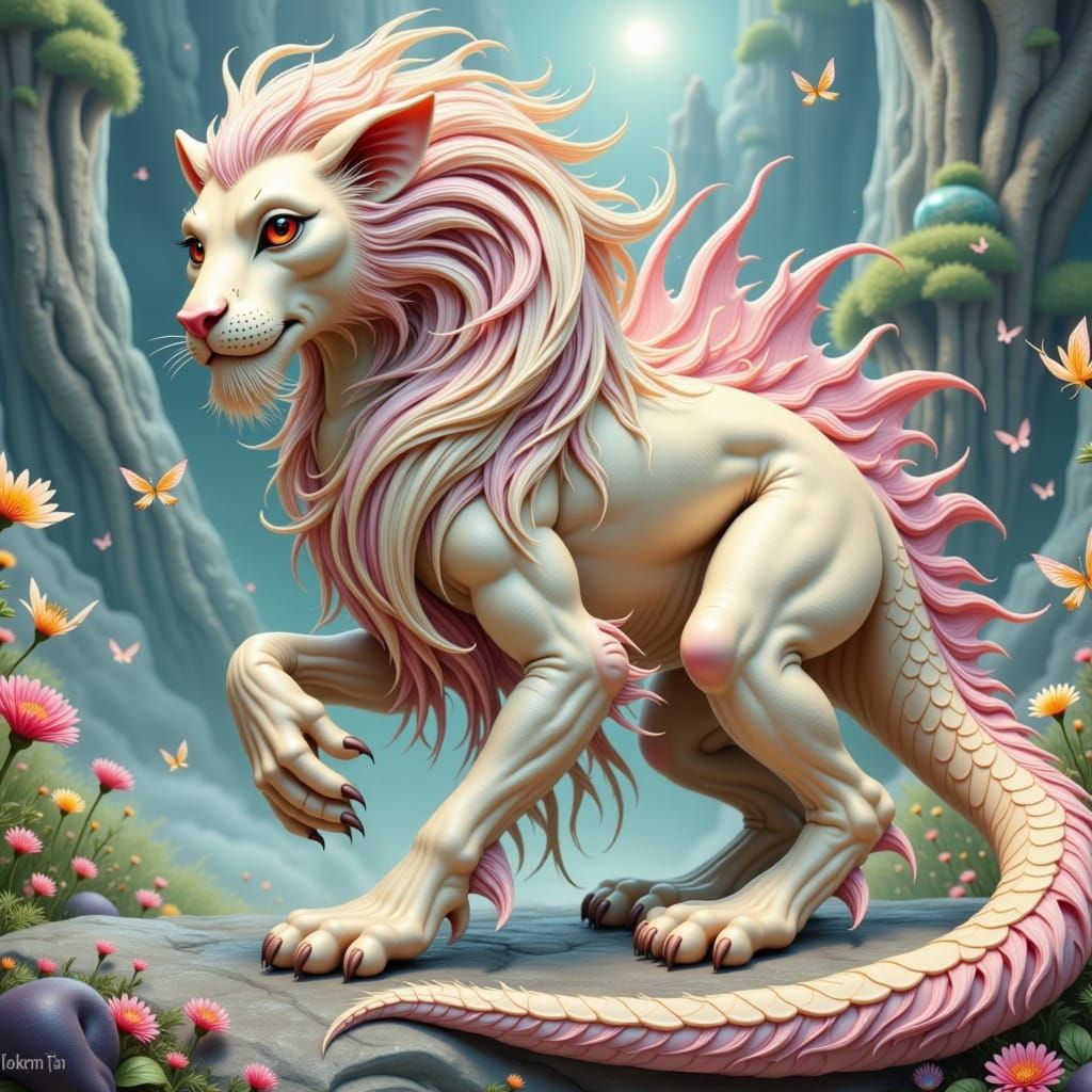 This enchanting image showcases a majestic dragon-lion hybrid, blending fantastical realism with dreamlike quality, in a style reminiscent of Eastern-inspired fantasy art.