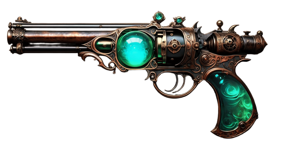 A hyperdetailed Steampunk fantasy pistol with intricate details, featuring a handcrafted iron and wood design, with a glowing crystal formation and bubbling liquid, set against a dark background.