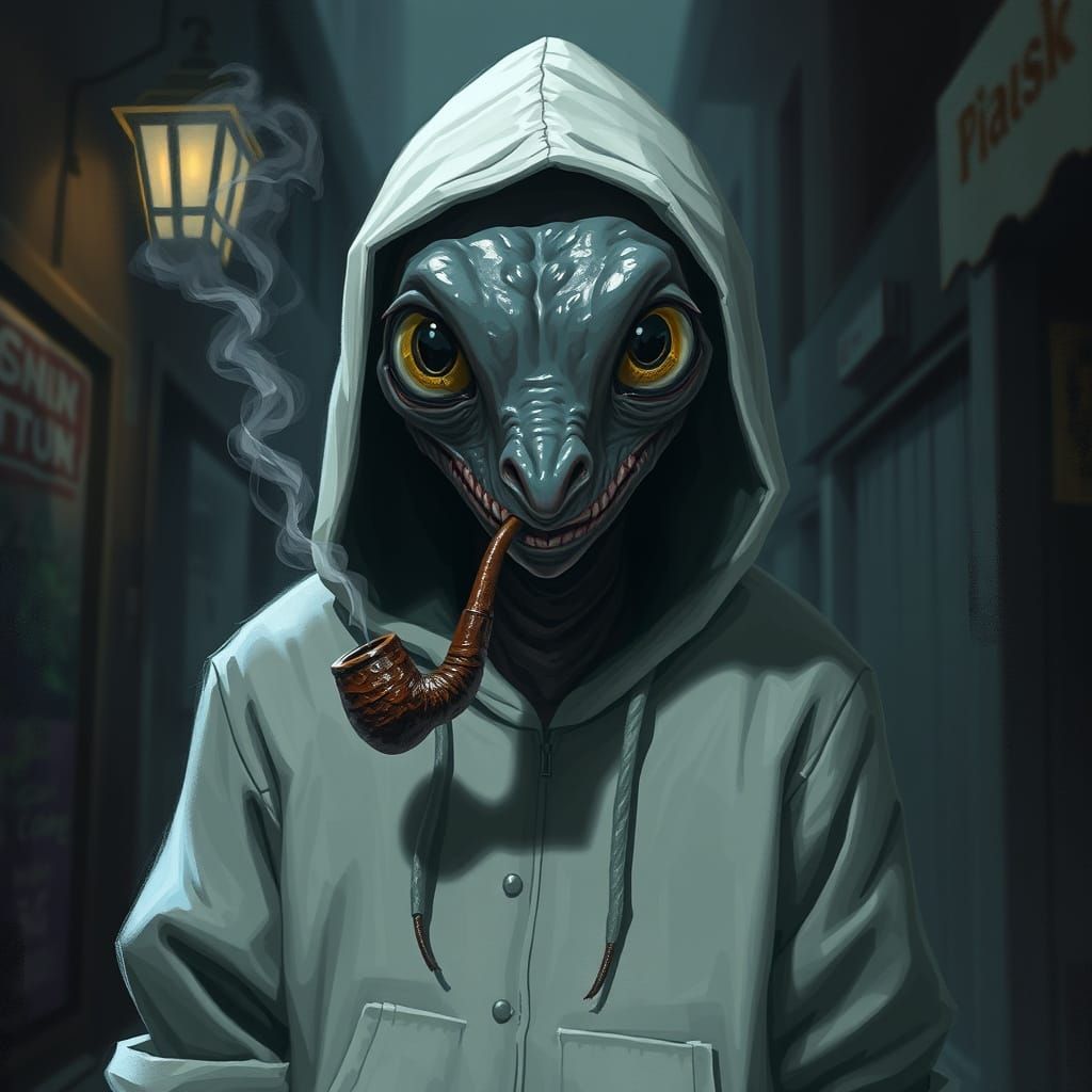 This image shows a surreal, nocturnal scene of an eel with human legs, smoking a pipe, set against a dark, mystical backdrop, blending noir and mystical elements.