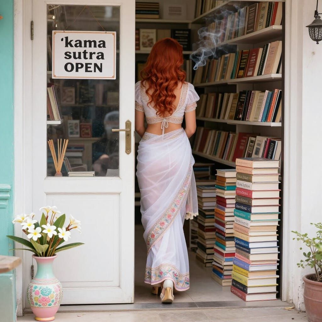 A close-up of a pin-up's legs in high heels, hidden behind parcels of Kama Sutra books in a pastel-decorated Indian bookstore with incense smoke and sunlight.