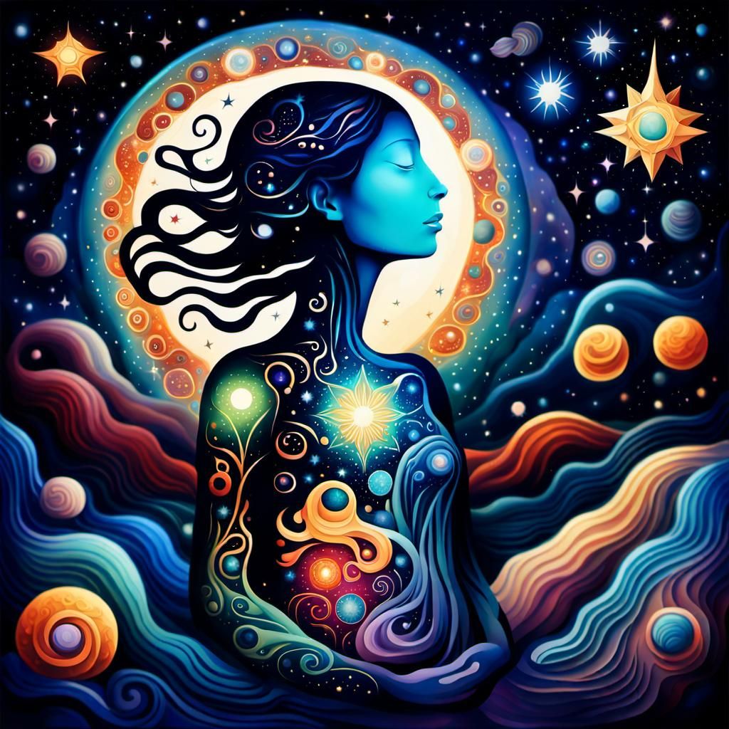 A striking picture of a human figure amidst stars and galaxies in a surreal space. The artwork, rendered with rich colors and intricate carvings, evokes a sense of wonder and cosmic rebirth.