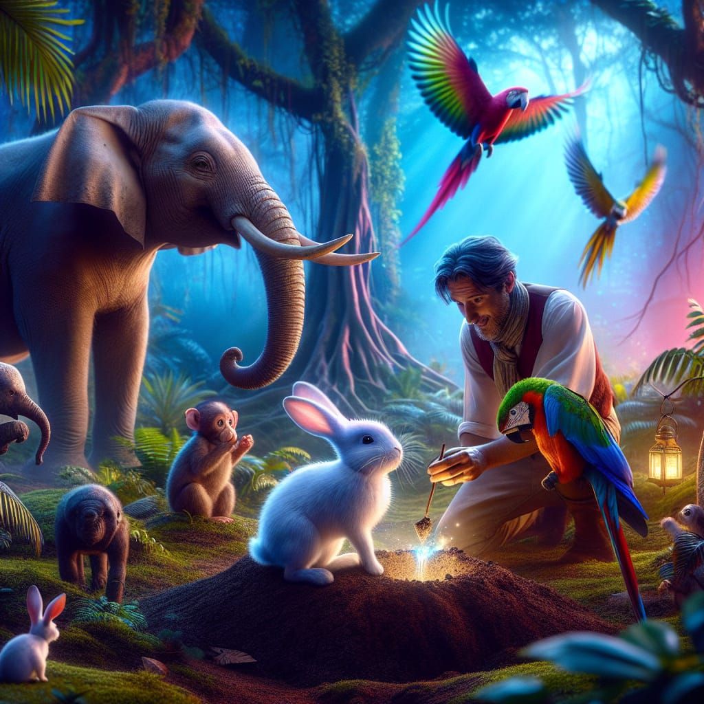 This image shows a jungle clearing where a white rabbit plants a glowing seed. An elephant, monkey, and parrot observe the magical scene. The hyperrealistic digital art features side lighting and vibrant colors.