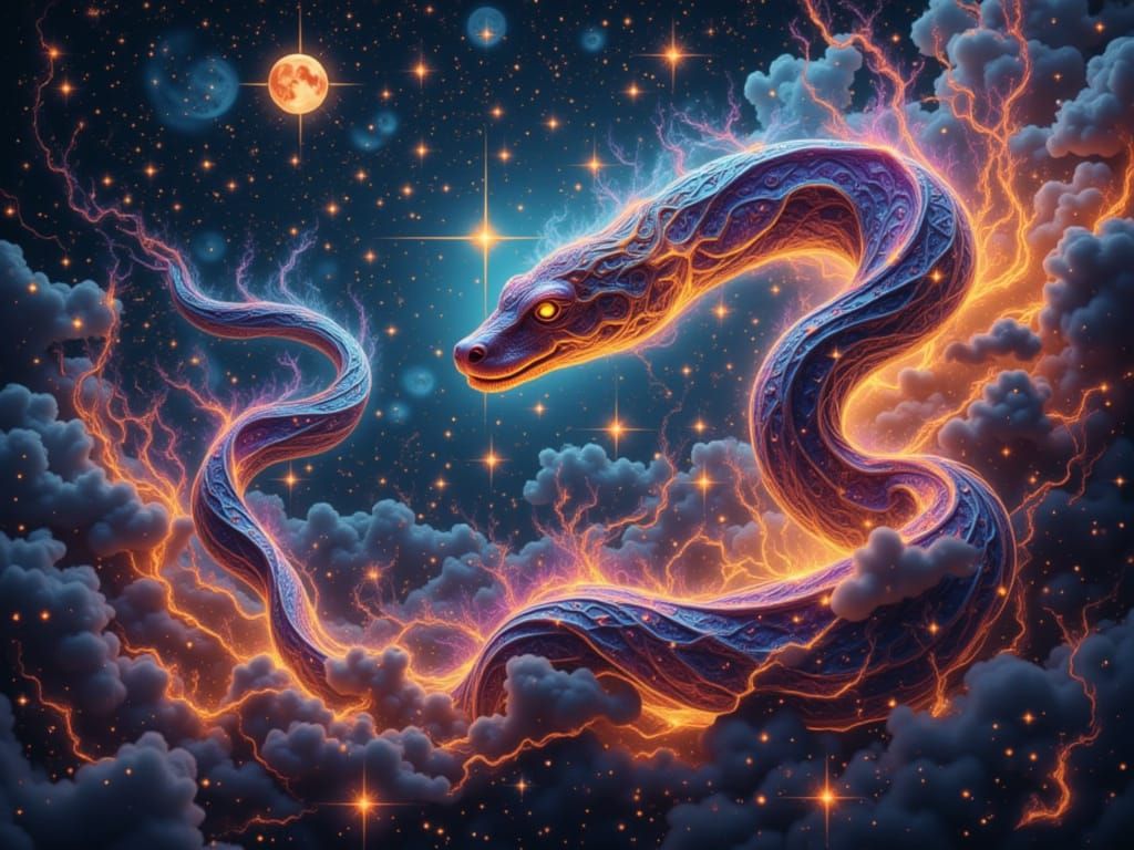 This image shows a holographic illustration of a cosmic snake helix, featuring vibrant, ethereal colors and intricate details illuminated by nebulae and galaxies. Rendered as mixed media art.