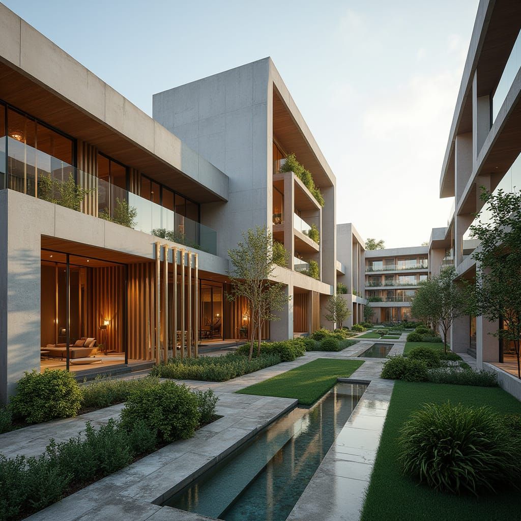 This modern luxury residential complex features sleek architecture, beautifully landscaped gardens, and a blend of minimalist and futuristic elements, showcasing a seamless fusion of functionality and aesthetics.