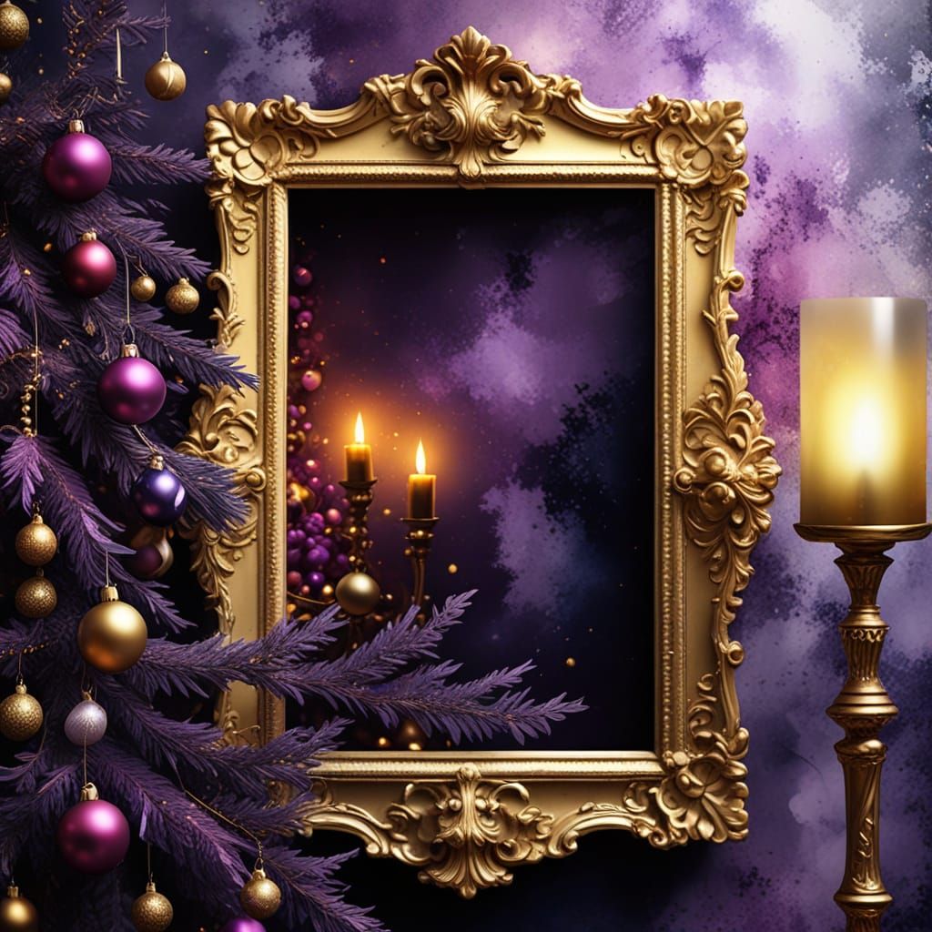 This image features a digital matte painting of a Christmas card frame, richly decorated with fir branches and opulent gold and purple ornaments. It showcases a baroque style with neo-impressionist touches, rendered in watercolor with impasto acrylic textures and dramatic lighting.