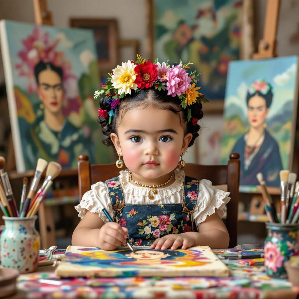 This image shows a photorealistic baby Frida Kahlo in her studio painting a self-portrait. She wears a miniature floral crown and sports a tiny unibrow in a warm and whimsical style.