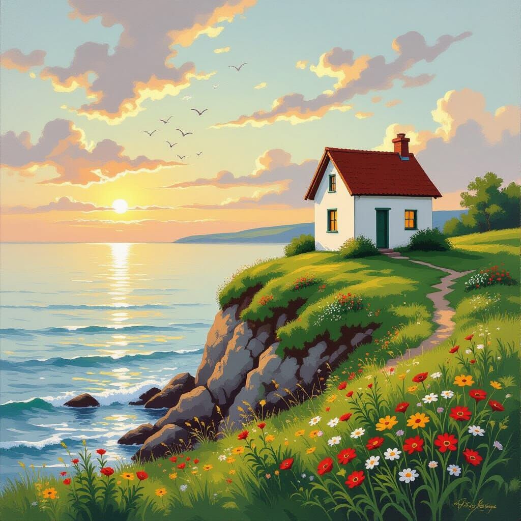 vintage oil painting of a small summer house on a green cliff above the sea, lush vegetation around, colorful wildflowers, gentle sunset lig...