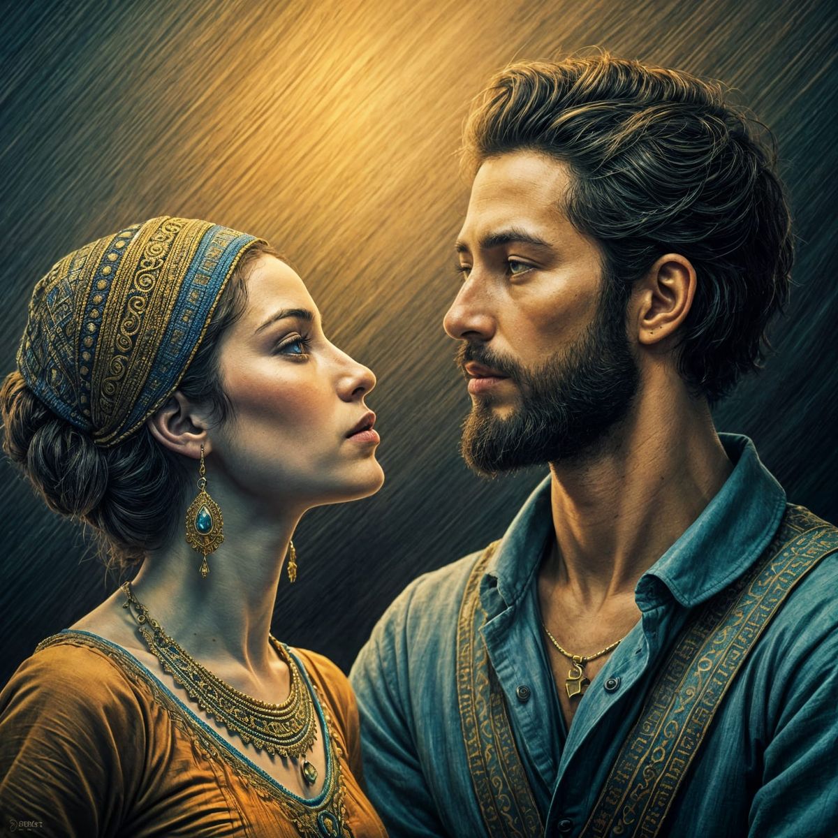 This image depicts a man and woman making unusual facial gestures in a diagonal composition, blending elements of Western and African art with a splash of vibrant colors and abstract styles.